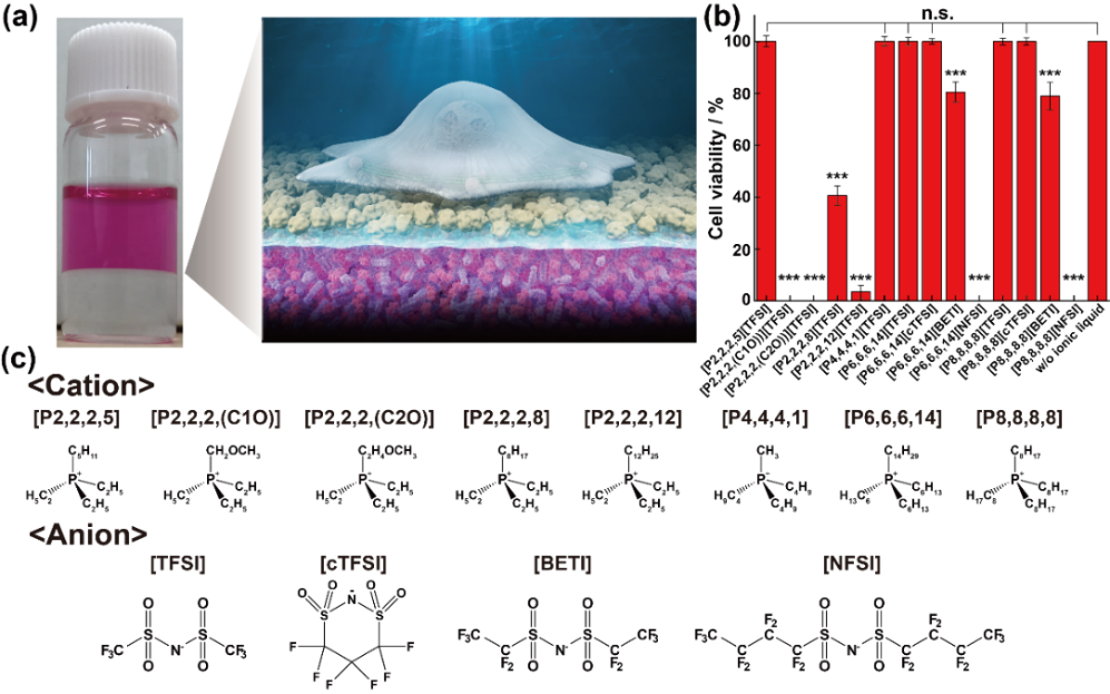 図1 疎水性イオン液体(IL)の細胞毒性評価と化学構造 (a)水相(培地)と疎水性IL相が明確に相分離する界面培養系の概念図(左:二相分離の外観、右:界面に形成される足場環境のイメージ図)。(b) IL飽和培地中で培養した細胞の生存率を指標とした毒性評価の結果。(c) 本研究で評価した疎水性ILの化学構造(カチオン/アニオン)一覧。Wiley社の許可を得て転載。一部改編。
