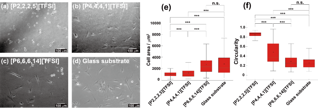 [P2]、[P4]、[P6]の界面でhMSCs(ヒト間葉系幹細胞)を培養した。図2(a)–(d)に各IL界面およびガラス基板上における細胞の位相差像を示す。結論を先に言えば、IL界面でも細胞は生存し得るだけでなく、伸展する場合としない場合があり、その差がカチオン構造に依存して現れた。位相差像からは、[P4]および[P6]界面では細胞が顕著に広がり、ガラス基板上に近い形態を示す一方、[P2]界面では伸展が抑制され、丸みを帯びた形態が優勢であることが分かる。これらの差は、定量化した細胞面積や伸展度の指標にも反映された(図2(e), (f))。一般に接着性細胞は硬い基質上でより伸展し、柔らかい基質上で丸まりやすい。定性的にhMSCsは[P2]界面を相対的に“柔らかい”足場として感じており、[P4]および[P6]界面を“硬い”足場として感じているように見える。