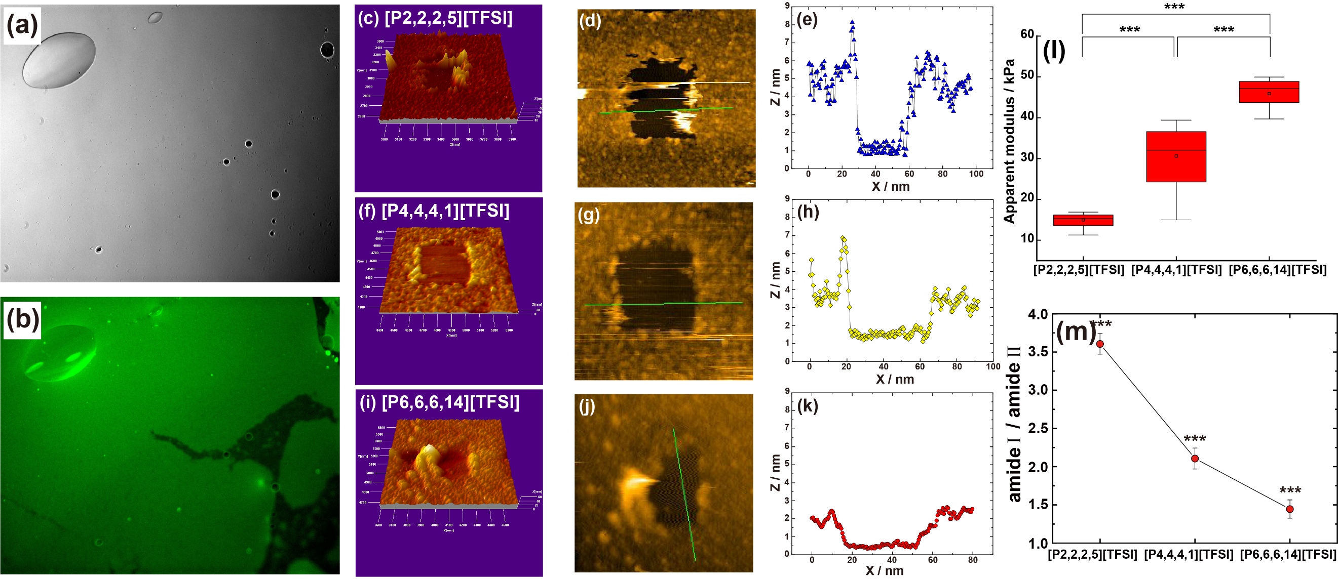 図4 疎水性IL界面に形成されるプロテインナノレイヤー(PNL)のキャラクタリゼーション FITC蛍光色素でラベル化したBSAを接触させた後の[P6]界面における(a)明視野画像と(b)蛍光画像。 (c–e) [P2]界面に形成したPNLのAFM像(3D表示)、カンチレバーによるスクラッチ後の観察像、およびラインプロファイル(高さプロファイル)。(f–h) [P4]界面で形成したPNLのAFM像(3D表示)、スクラッチ後の観察像、および高さプロファイル。(i–k) [P6]界面で形成したPNLのAFM像(3D表示)、スクラッチ後の観察像、および高さプロファイル。(l) AFMナノインデンテーションにより評価したPNLの見かけの弾性率(ヤング率)の比較。(m) ATR-IRにより評価したBSA由来アミドI/アミドII強度比(I/II)の比較(吸着変性の指標)15。Wiley社の許可を得て転載。