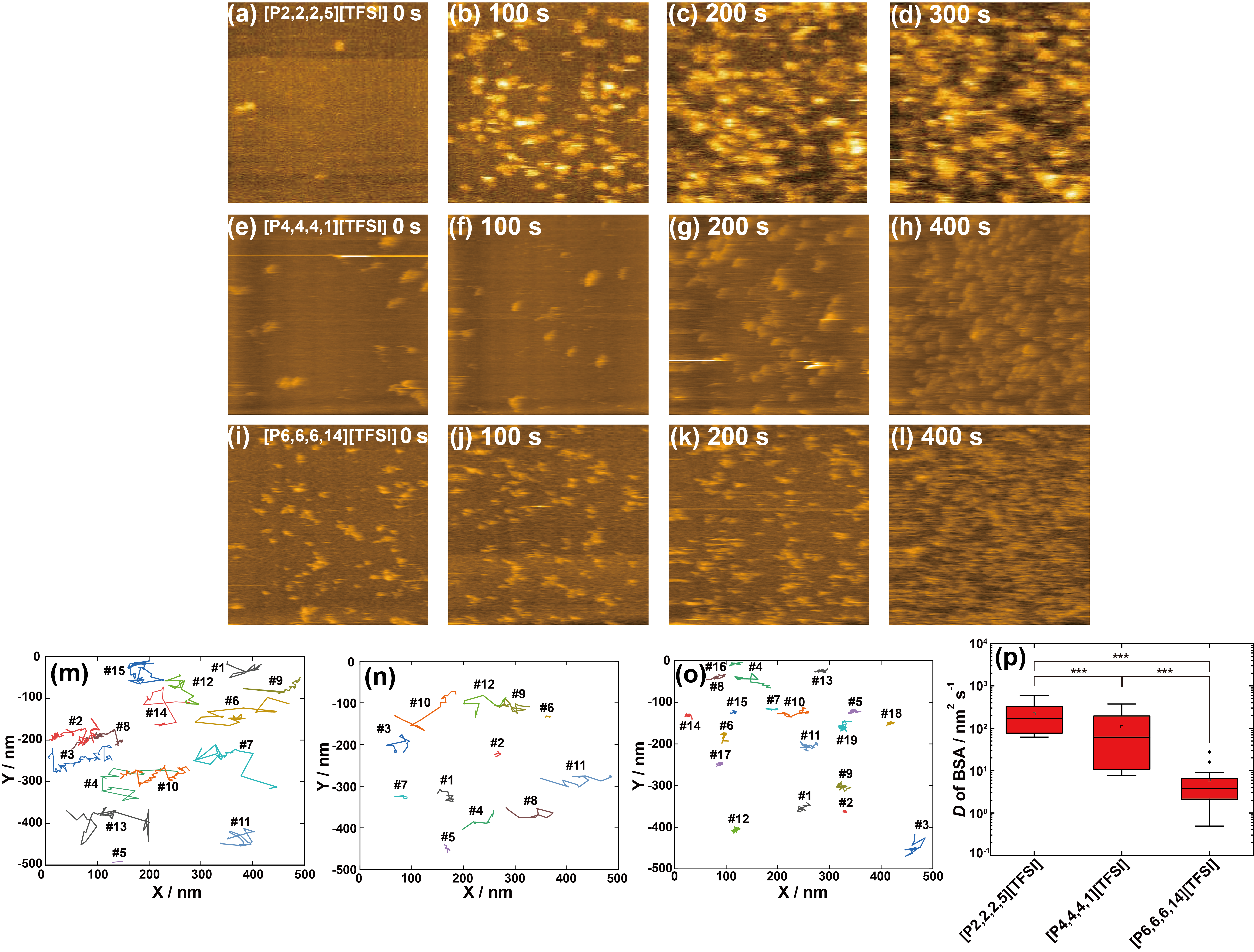 (a–d) [P2]界面におけるBSA吸着過程の高速AFMスナップショット(0、100、200、300 s)。(e–h) [P4]界面におけるBSA吸着過程の高速AFMスナップショット(0、100、200、400 s)。(i–l) [P6]界面におけるBSA吸着過程の高速AFMスナップショット(0、100、200、400 s)。(m–o) 各IL界面における高速AFM像の粒子追跡解析により得られたBSA粒子の界面上ブラウン運動。(p) 平均二乗変位と時間の関係から算出したBSA粒子の界面二次元拡散係数Dの比較15。Wiley社の許可を得て転載。