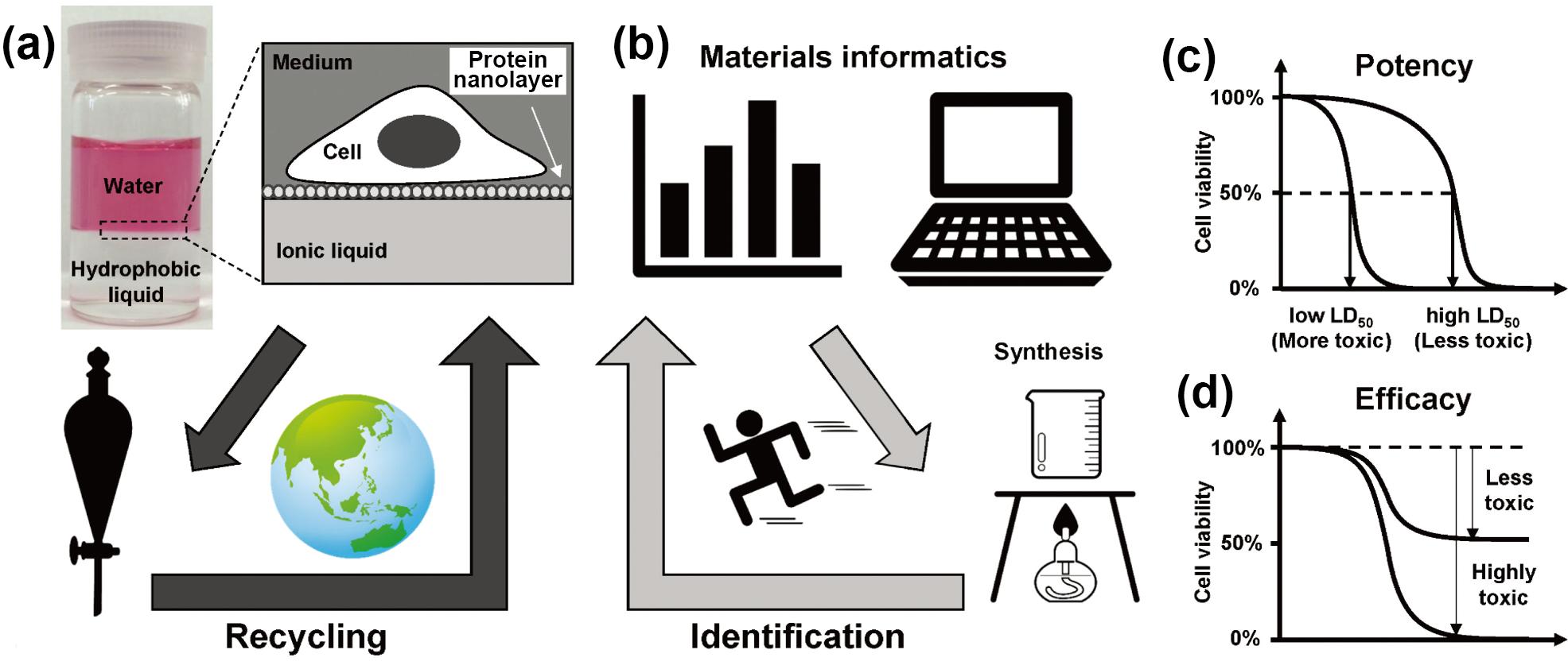 図9 材料インフォマティクス(MI)を用いた疎水性イオン液体の細胞適合設計の概念図 (a) 水相/リサイクル可能なIL相が形成する二相界面における細胞培養の模式図。(b) MI(データ解析・予測)と合成・評価実験を往復させることで、低毒性IL候補を効率よく同定する研究フロー(探索→同定→リサイクルの循環を含む)。(c) 従来の毒性評価指標であるpotency(LD50)の概念図。(d) 界面培養条件に即したefficacy(飽和溶解条件下での生存率)による評価概念図(同じLD50でも実使用条件での毒性が異なり得ることを示す) 19。Taylor & Francis社の許可を得て転載。