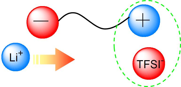 図5. Zwitterionic liquidにLiTFSA塩を加えると高イオン伝導度が得られた。