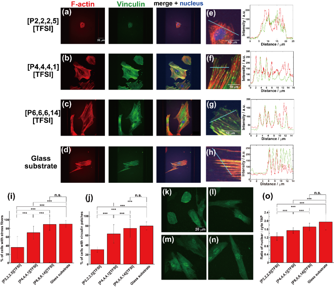 図3 疎水性アルキルホスフォニウム系イオン液体(IL)界面上におけるhMSCsの焦点接着と力学応答の指標 (a–d) [P2]、[P4]、[P6]界面およびガラス基板上で培養したhMSCsの蛍光像(F-actin:赤、ビンキュリン:緑、核:青)。(e–h) 合成像の拡大図と、図中のラインに沿ったF-actin/ビンキュリンの蛍光強度プロファイル。(i, j) ストレスファイバーが形成されている細胞およびビンキュリン集積(パッチ)を示す細胞の割合の定量。(k–n) YAP(Yes-associated protein)染色像([P2]、[P4]、[P6]界面およびガラス基板)。(o) 核内YAP/細胞質YAP比の定量15。Wiley社の許可を得て転載。