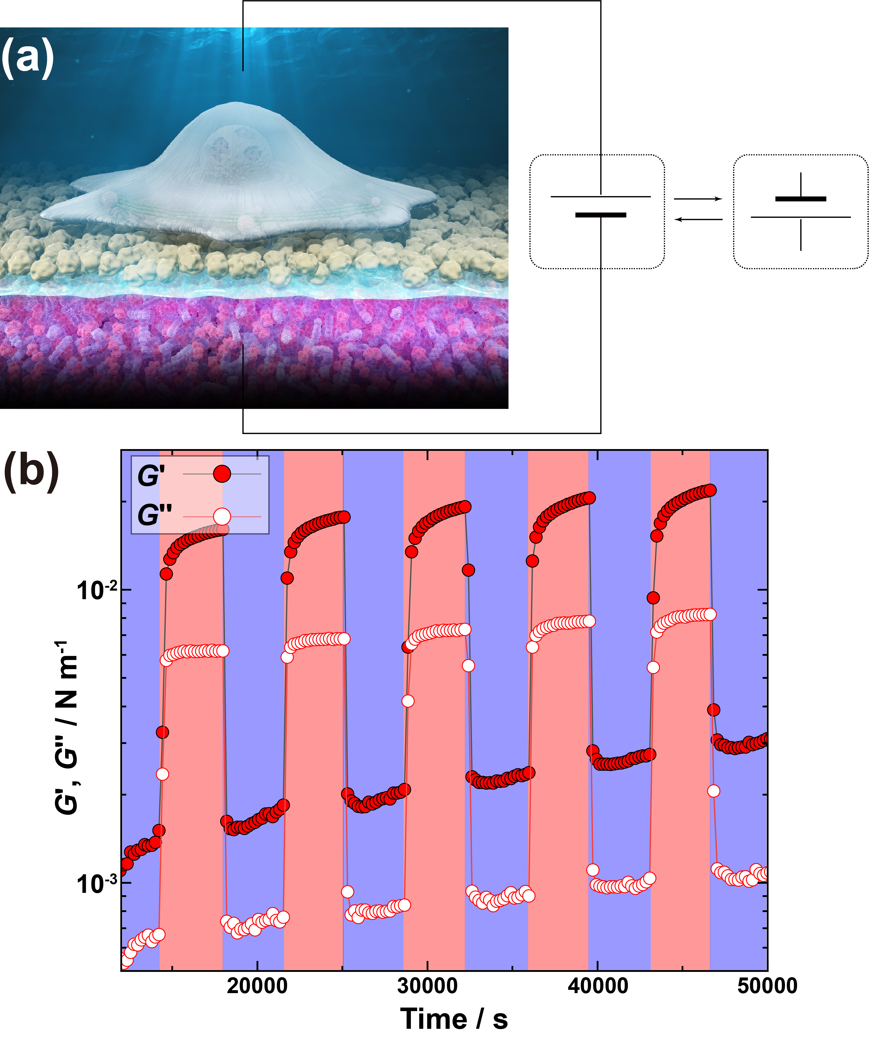 図6 電気化学的刺激によるPNL力学の可逆制御(概念図と界面レオロジー) (a)疎水性IL−水界面に形成されたPNLに対し、界面電位差を印加して界面近傍のイオン環境(配向・集積)を変調し、PNLの二次元粘弾性を制御する概念図。(b)界面レオロジーにより測定したPNLの貯蔵弾性率G′と損失弾性率G′′の電位応答。青色領域は-0.6V、赤色領域は+0.3V印加時を示し、電位切り替えに伴って界面粘弾性が可逆的にスイッチングすることを示す16。