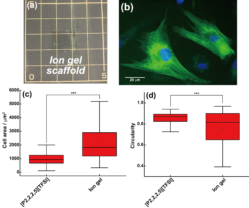 図7 イオンゲル化による足場バルク力学の導入とhMSCs伸展の安定化 (a) [P2] 中で、n-ブチルメタクリレート(nBuMA)をその場ラジカル重合して得た化学架橋イオンゲルの外観写真。(b) [P2]–PnBuMA イオンゲル界面上に接着・伸展したhMSCs(LifeAct-GFP;核は青)の蛍光像(スケールバー:20 µm)。(c, d) [P2] 液体界面と [P2]–PnBuMA イオンゲル界面で培養したhMSCsの細胞面積および真円度の比較15。Wiley社の許可を得て転載。