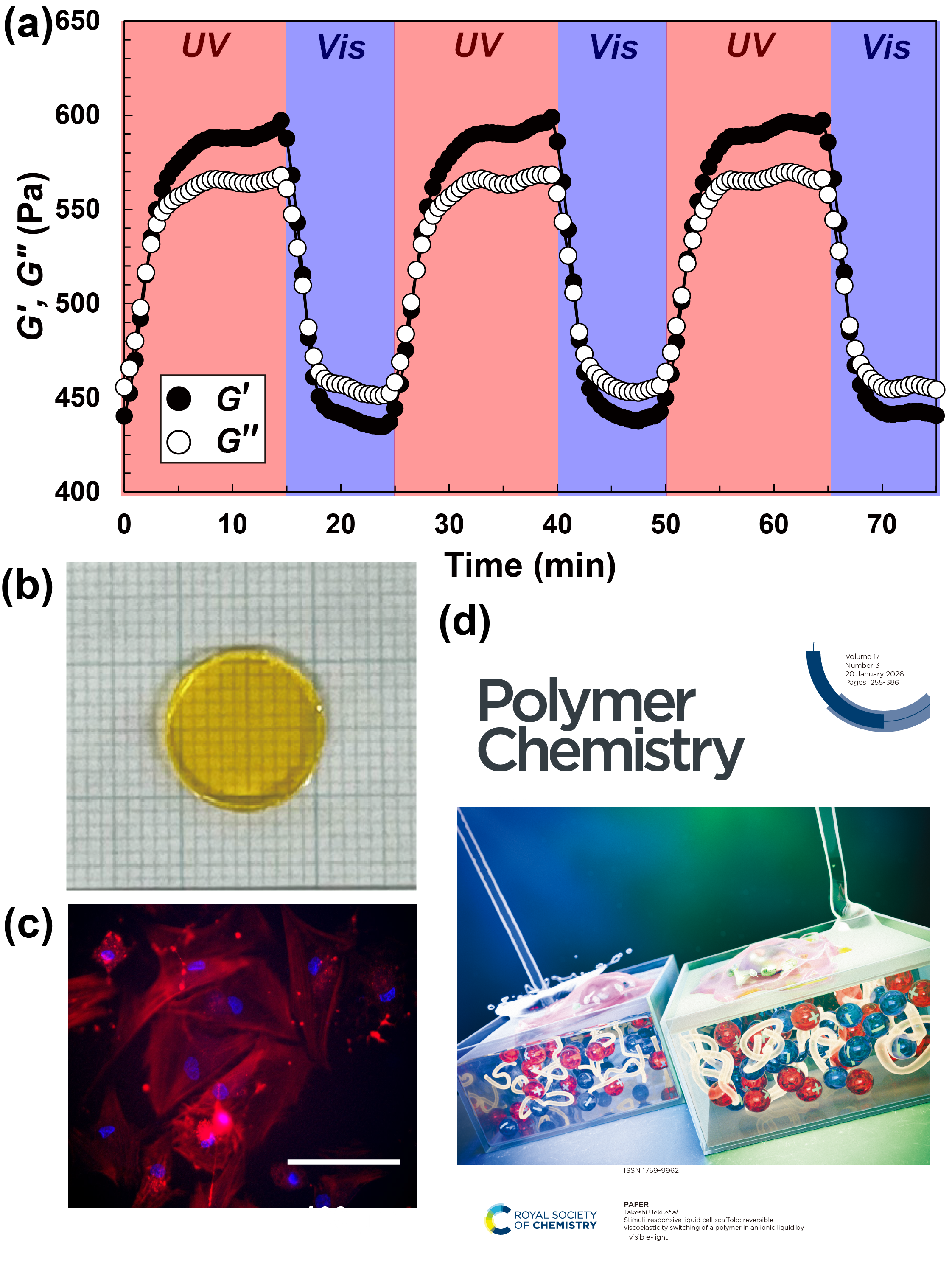 - Saruwatari, A.; Kamiyama, Y.; Tamate, R.; Nakanishi, J.; Ueki, T. Toward Dynamic Liquid Cell Scaffold: Photoreversible Ion Gels Exhibiting Light-Induced Sol-Gel Transitions. Macromol Rapid Commun 2026, e00909. DOI: 10.1002/marc.202500909.